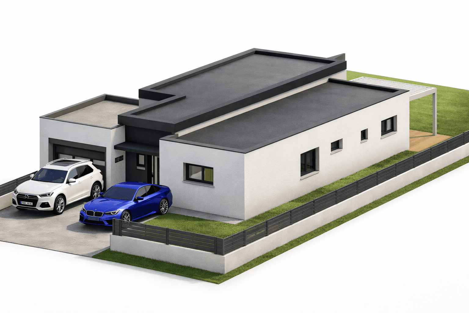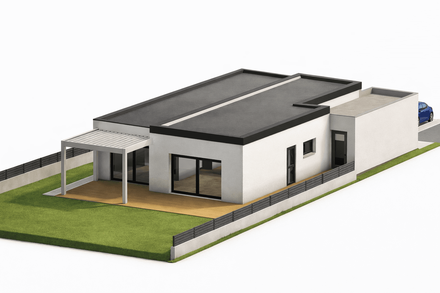 Maison Linéa propose une architecture minimaliste où la pureté des formes guide l’ensemble du projet. Les volumes horizontaux, la toiture terrasse et les débords dessinés apportent une silhouette nette et contemporaine.